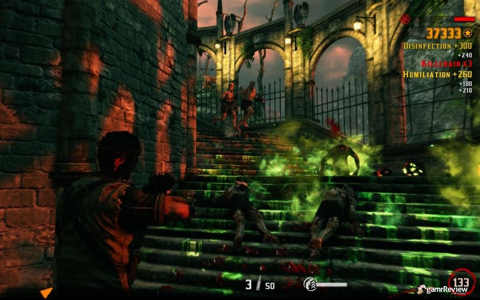 The game's difficulty is ridiculously hard on Normal and only slightly better on Easy. Even in single player, you'll have a devil of a time learning the controls due to being pounded incessantly by an endless stream of enemies. Until upgraded, guns in general just aren't all that effective (it's actually more effective to kick a demon in the head than to shoot it) and surviving long enough to upgrade them is definitely a challenge. This, as you might expect, is very frustrating, and in multiplayer means you'll be dying a lot. It also means you could spend most of the multiplayer match watching rather than playing.